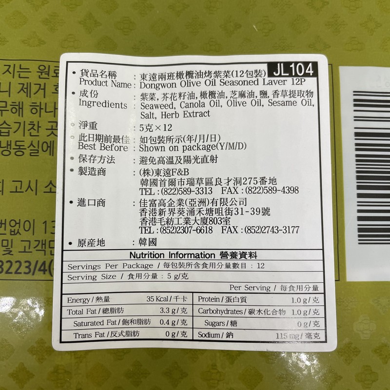 東遠兩班橄欖油烤紫菜 12 X 5GM