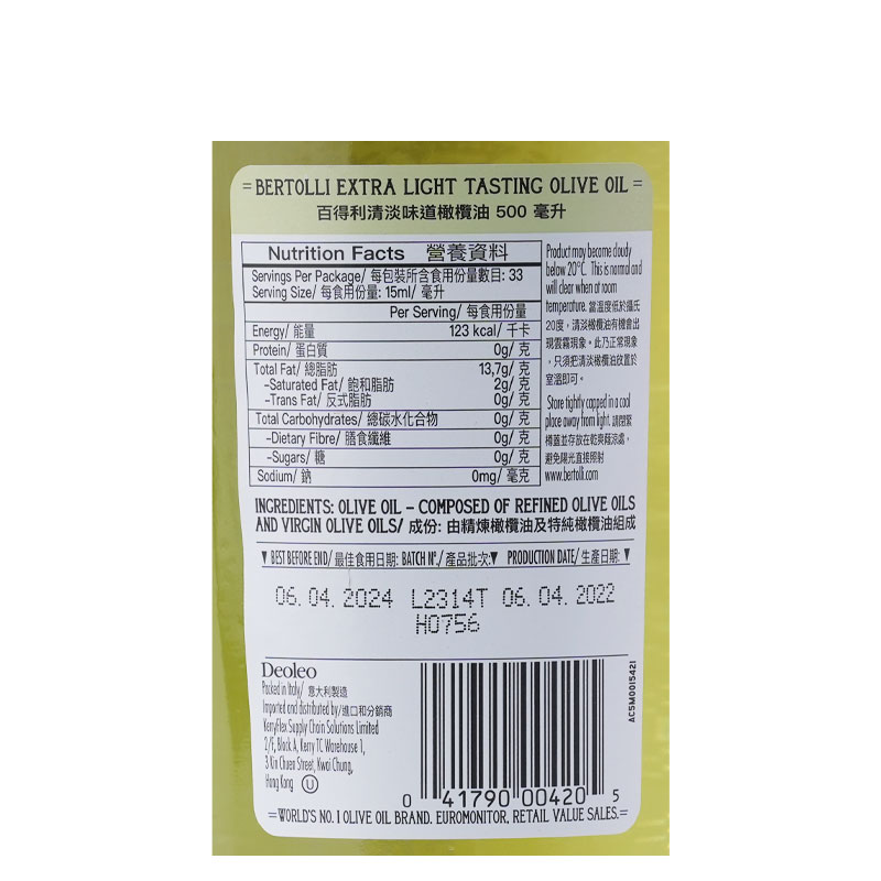 百得利清淡橄欖油 500ML
